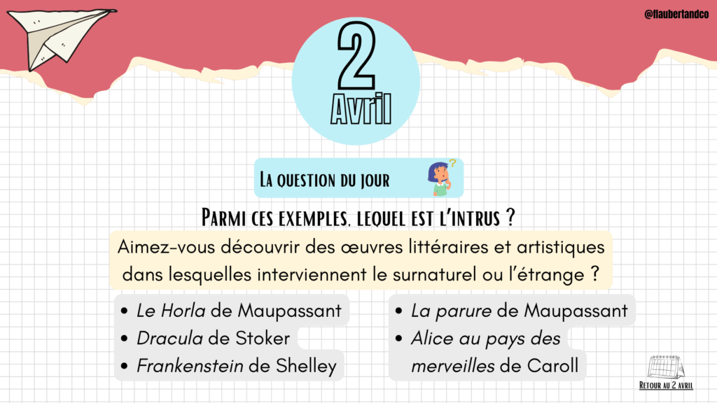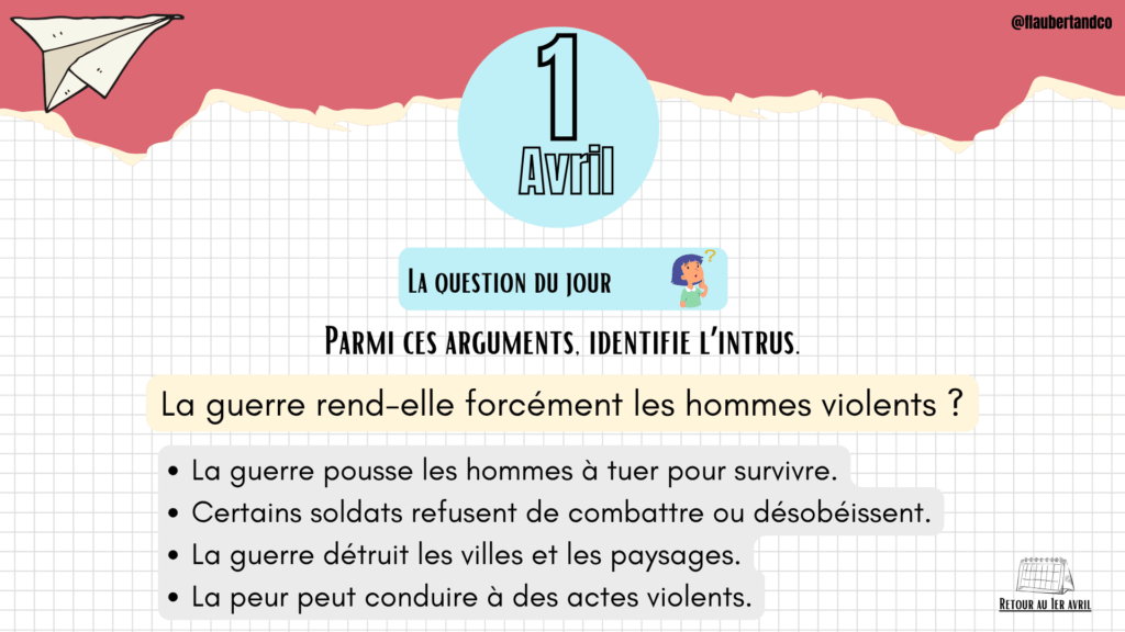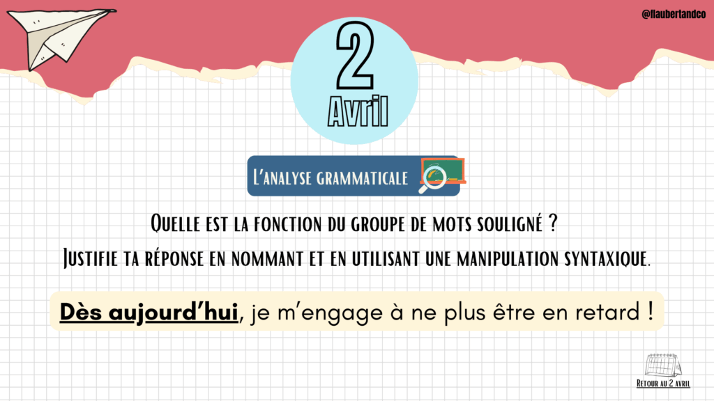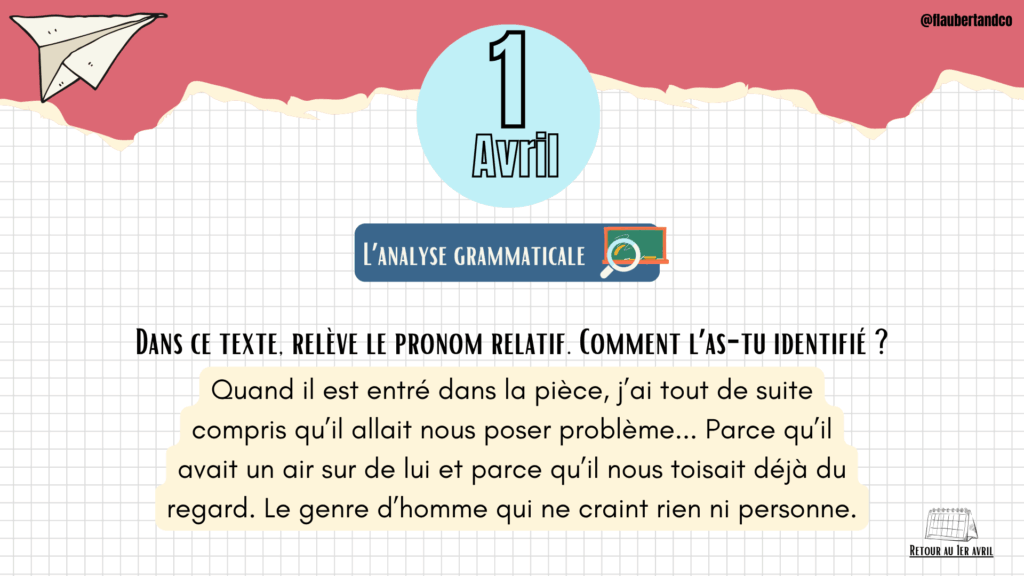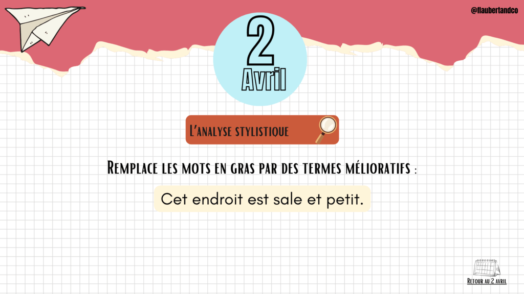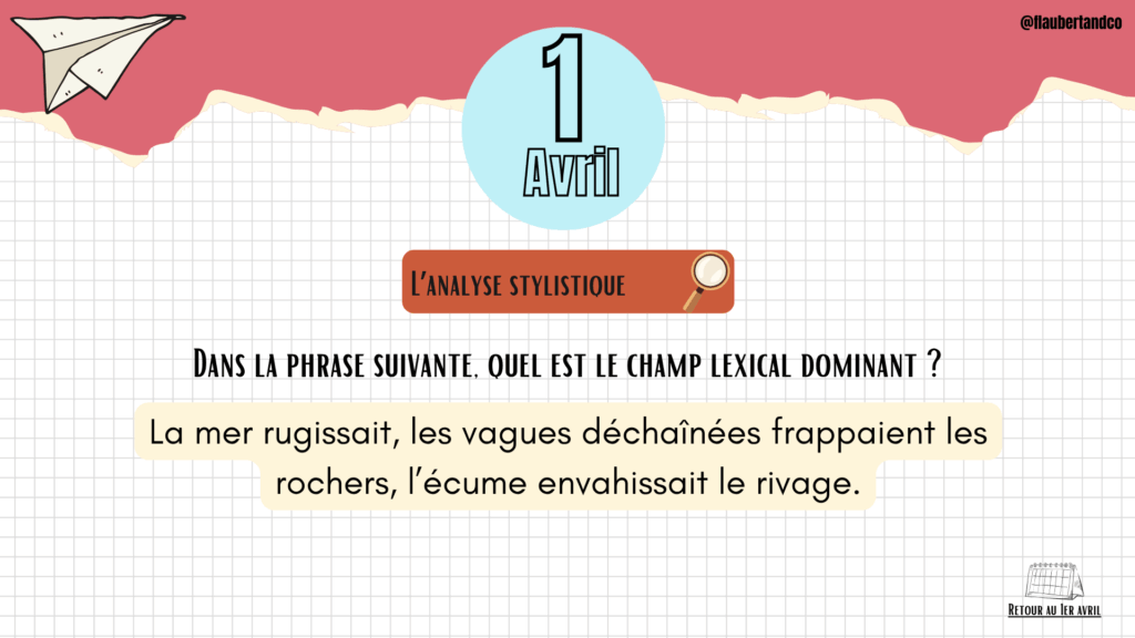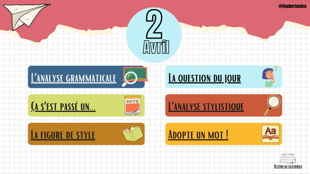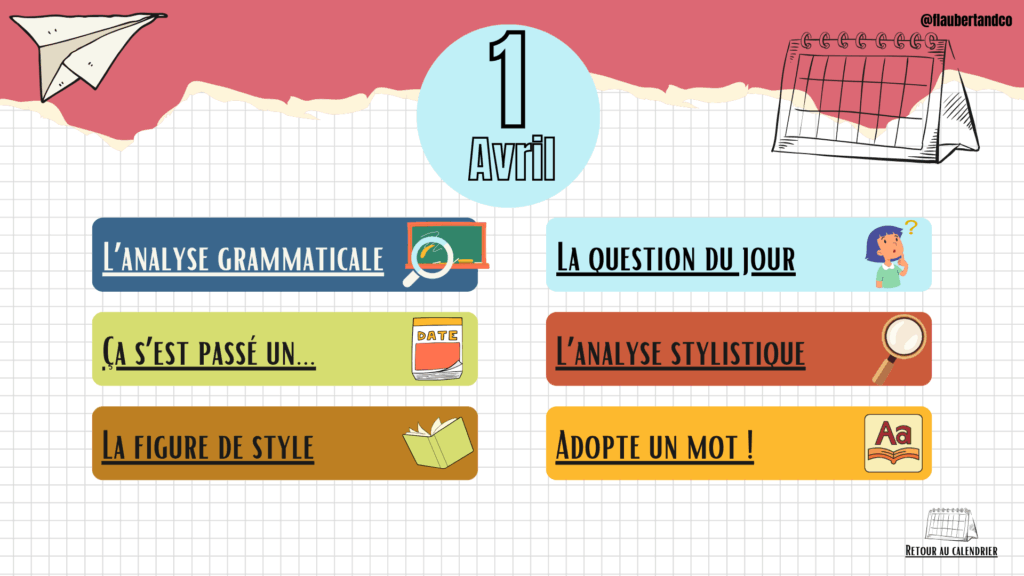 Chaque jour, une phrase ou un petit texte est proposé. Il s’agit d’utiliser des procédés stylistiques pour les analyser. Des questions sont posées sur le caractère du personnage, le rythme du texte, sa chronologie…