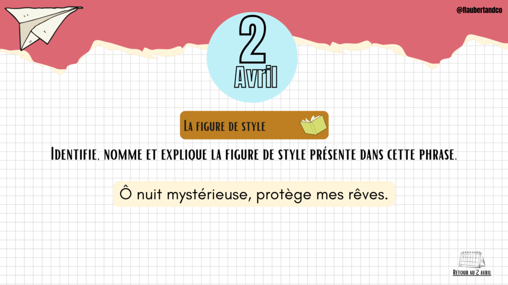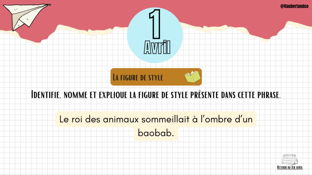 Cet exercice est toujours le même. Une phrase est proposée, contenant une figure de style. Il faut l’analyser et identifier la figure de style présente.