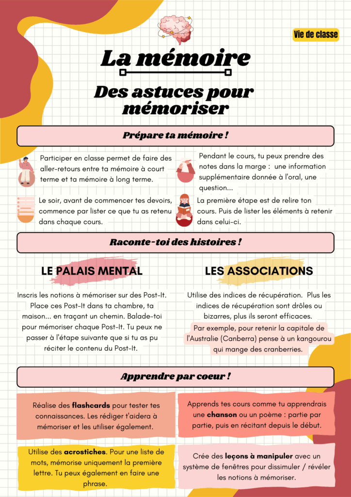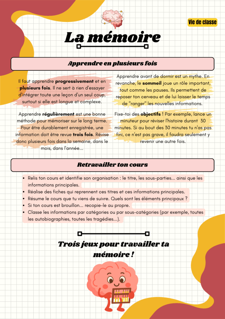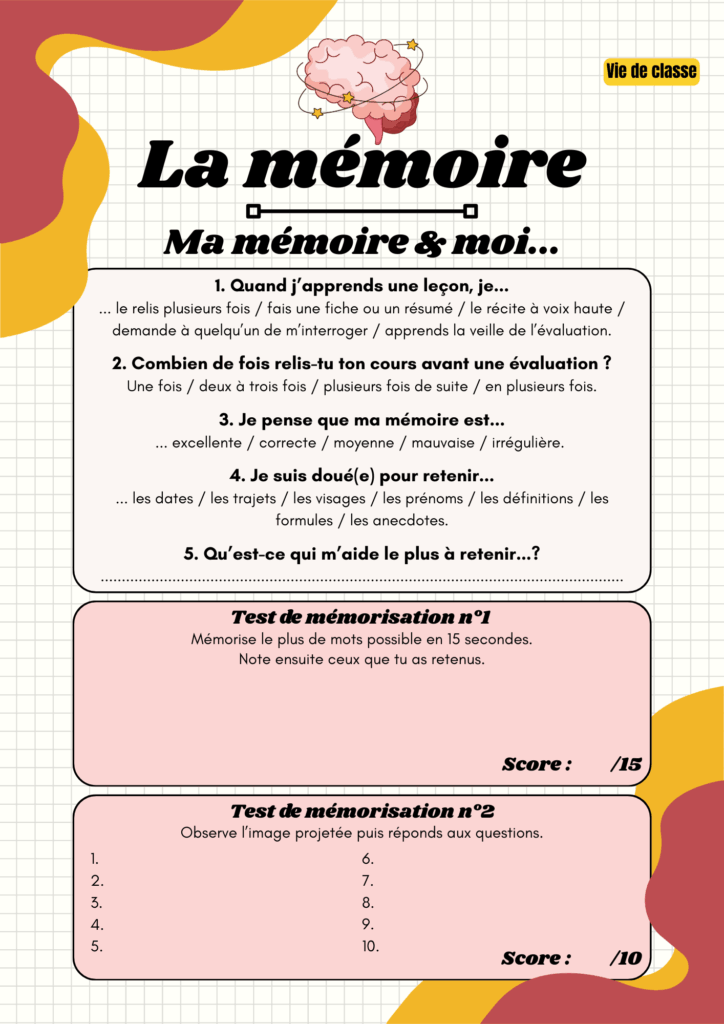 • Objectifs : permettre aux élèves de comprendre le fonctionnement de leur mémoire ; partager des astuces de mémorisation.